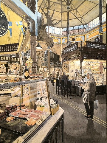 Östermalmshallen i Stockholm. Signerad av konstnär Johan Persson.