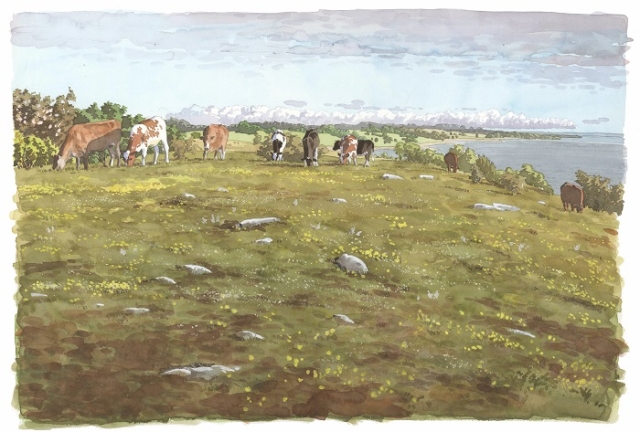 Reproducerad akvarell/giclée - Betande kor på strandängarna vid Äleklinta