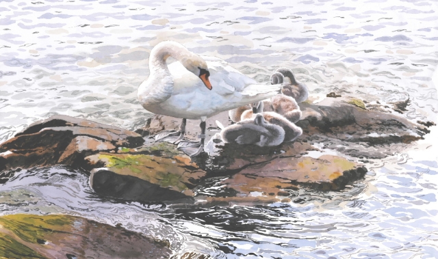 Knölsvan med ungar. Skönt ljusa och naturliga färger och stor detaljrikedom. Signerad av konstnär Johan Persson.