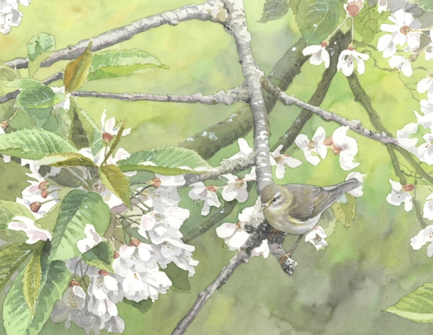 Reproducerad akvarell/giclée - Lövsångare i blommande körsbärsträd