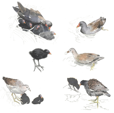 Reproducerad akvarell/giclée - Rörhönor med ungar