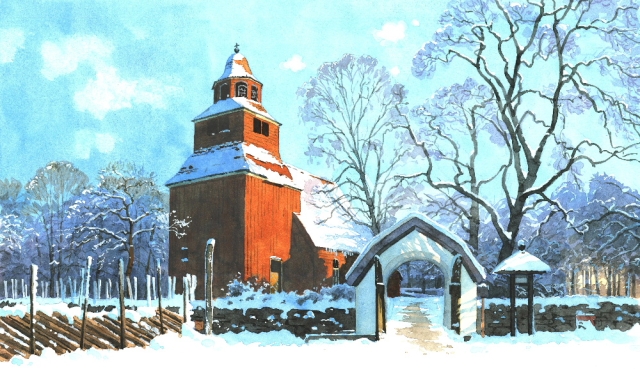 Reproducerad akvarell/giclée - Seglora kyrka på Skansen i vinterskrud