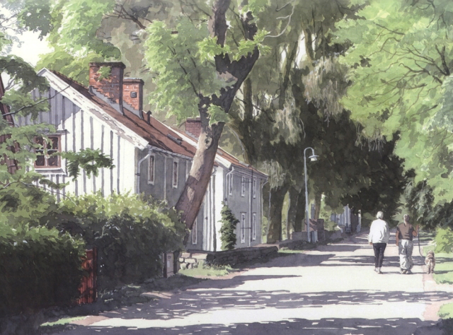 Tallriksunderlägg med motiv från bygatan i Vickleby på Öland målad detaljrik i sköna och naturliga färger.